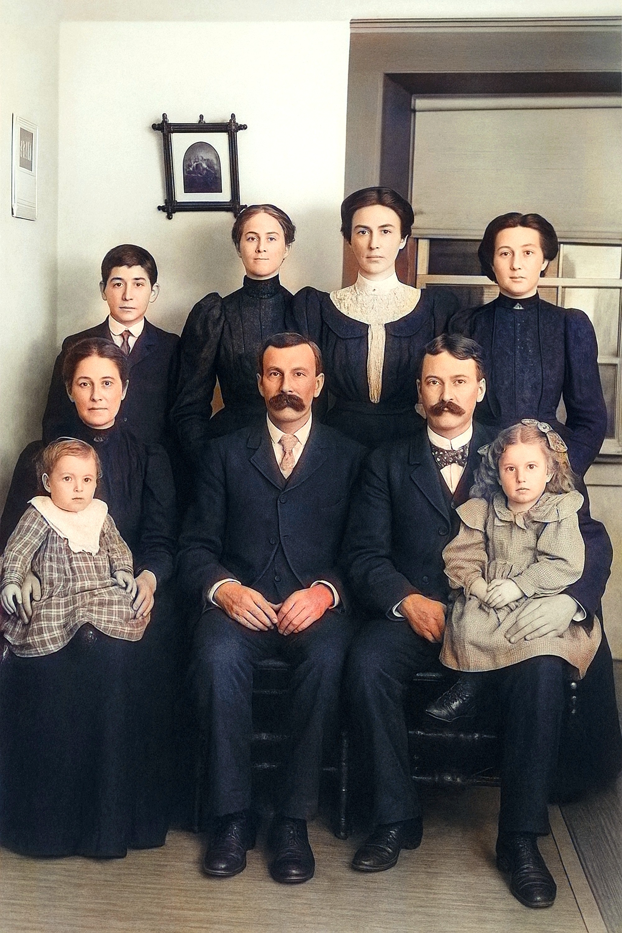 Middle Row, left to right: Ida Elmira (Blake) Abbey (born 1858); William Searle Abbey (born 1853); and Erwin William Abbey (born 1876).