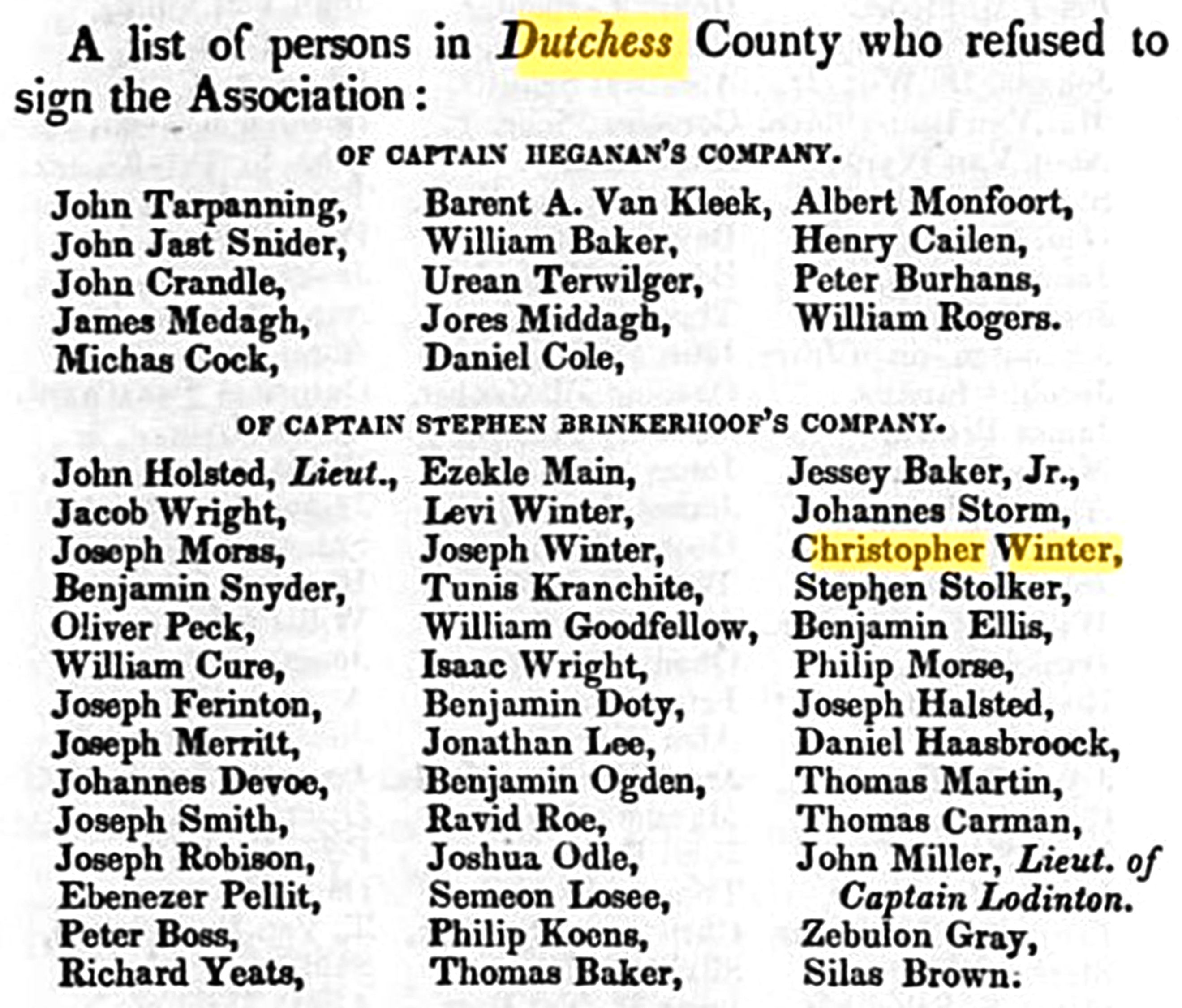 Articles of Association, 1775 1775-04-29 On April 7, election of deputies to a New York Provincial Congress made at New Paltz by a "committee" of Patriots Document that required the loyalty of New York citizens to the American cause during the Revolution (1775-1783). General Association (Articles of Association) arrived in New Paltz and was signed. The Articles were prepared by the New York Provincial Congress and had been transmitted to the counties of New York to be signed in every town. The Articles formalized a boycott of British goods until Parliament repealed the Intolerable Acts. The Articles were signed in New Paltz at the home of Ann DuBois. On April 19, the Battles of Lexington and Concord took place, beginning the American Revolution. The news of the battles reached New York on April 23rd. Mary "Polly" Winter was born April 11, 1777, in Fishkill, Dutchess Co., Province of New York. 9–13 May 1777 – Christopher Winter Jr. appears before NY Commission for Conspiracies, takes oath of allegiance, discharged (Fishkill/Fredericksburgh, NY). Internet Archive+1 1778 – Christopher Winter Jr. is a Private in Butler’s Rangers, Capt. John McDonell’s Company (payroll entries). Google Sites+1 James Winter was born November 26, 1780, in Vermont. Lewis Winter was born June 1, 1782, in Salisbury, Litchfield Co., CT. Paddick Vadoch Winter was born September 2, 1787, in Dutchess Co., NY. He arrived in Ontario, Canada, in 1797. Christopher Winter Jr. served in Butler’s Rangers as a Loyalist from New York, lost his property there during the Revolutionary War, and became eligible for Crown land in Upper Canada as compensation. Christopher Winter, a Private in Butler's Loyalist Rangers, was granted land on October 1, 1787, for his military service. The 1790 U. S. Census taken in 1790, shows Christopher Winter is living in Fishkill, Dutchess Co., NY. Living there are: 1 Male age 16 and over; 3 Males under age 16; and 3 Females. The name Fishkill evolved from two Dutch words, “vis” (fish) and “kil” (stream or creek). Dutch immigrants, in the year 1714, searching for an acceptable location to settle and prosper, chose the area in and around the modern Village of Fishkill. Fishkill played an important role in the Revolutionary War when a vast military encampment was established one mile below the village to guard the mountain pass to the south. In 1797, Christopher Winter Jr. was living in Haldimand Twp., Durham Co., Upper Canada. Christopher Winter took up Lot. No. 20 in the 3rd Concession in Haldimand Twp., early in the Spring of 1797. He then improved 30 acres of the lot.