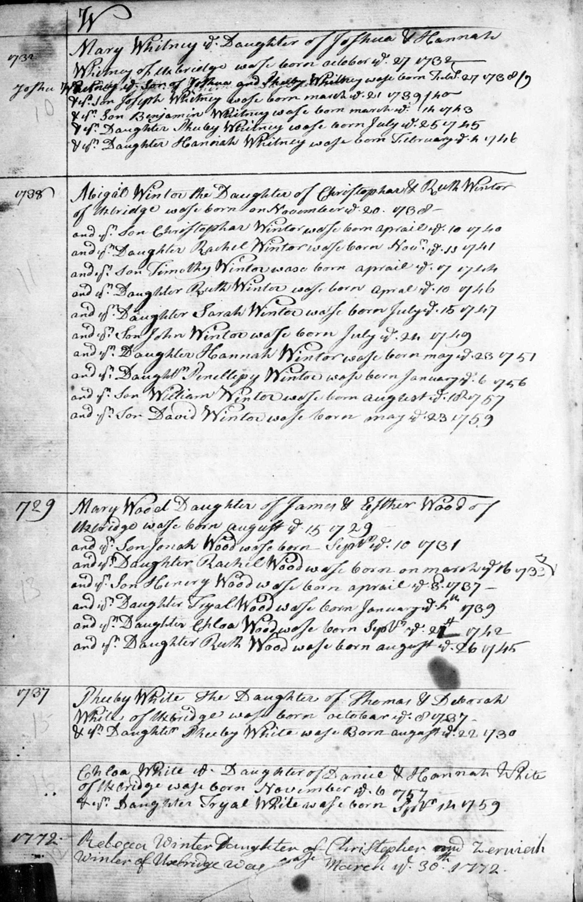 Christopher Winter Jr. was born April 10, 1740, in Uxbridge, Worcester Co., MA. Zeruiah Smith was born November 7, 1741, in Pomfret, Windham Co., CT. Christopher Winter Jr. and Zeruiah Smith, of Salisbury, were married by Rev. Jonathan Lee, October 22, 1767, in Salisbury, Litchfield Co., CT. John Winter was born August 13, 1768, in Salisbury, Litchfield Co., CT. Zeuriah Winter was born June 12, 1770, in Salisbury, Litchfield Co., CT. Rebecca Winter was born March 30, 1772, in Uxbridge, Worcester Co., MA.