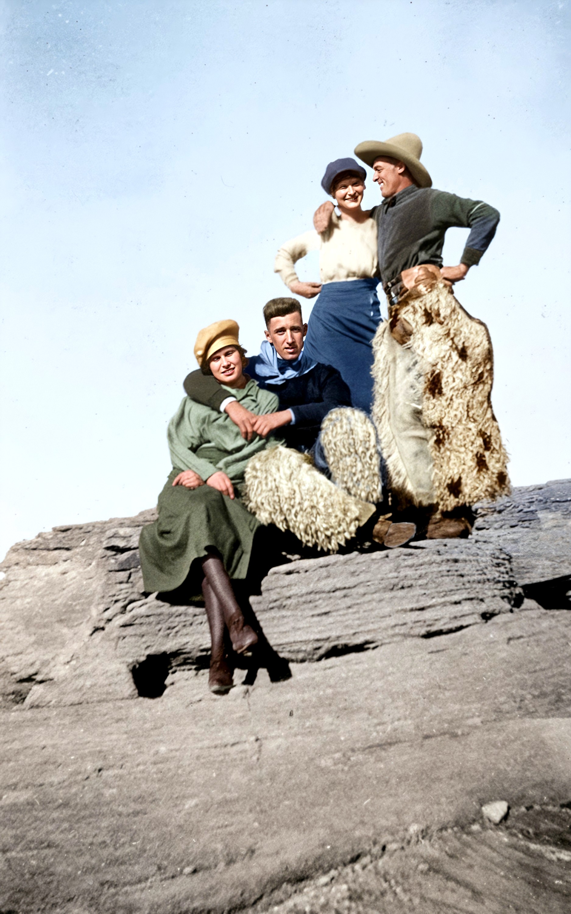 Oran Ralph Abbey standing on rock, about 1923; and left to right: Oran Ralph Abbey and James Audrey "Jimmy" Thompson with girls, about 1923. Black and white photos were from Kay Koslan.