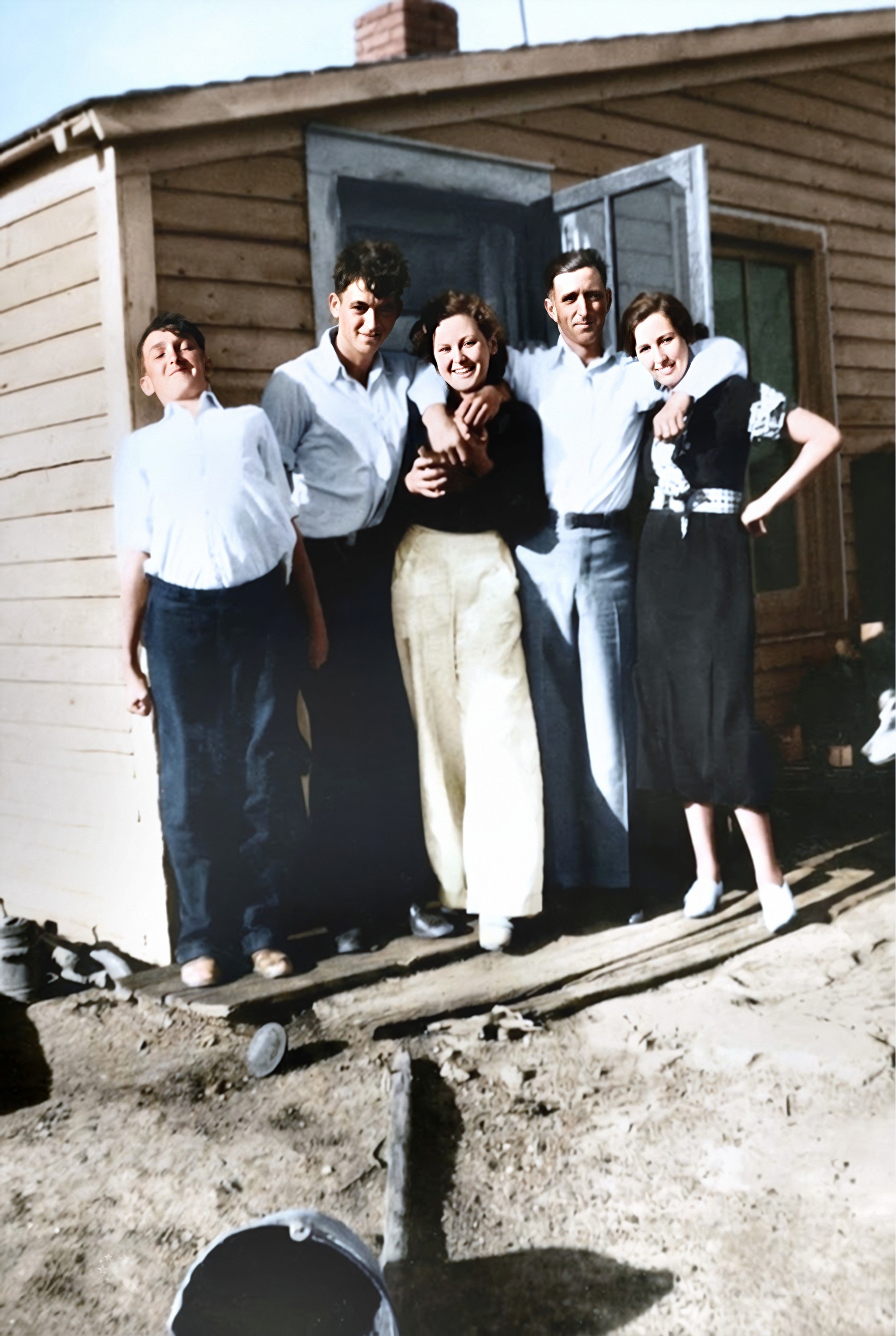 The Herman group, Left to Right: Philomena Bertha "Minnie" Tavis, Rebecca Margaret (Albers) Gentz, Alice Frances Herman, John Leslie "Joe" Easton, and Wilfred August Herman, North Dakota, about 1920. Photo courtesy of Kay Koslan.