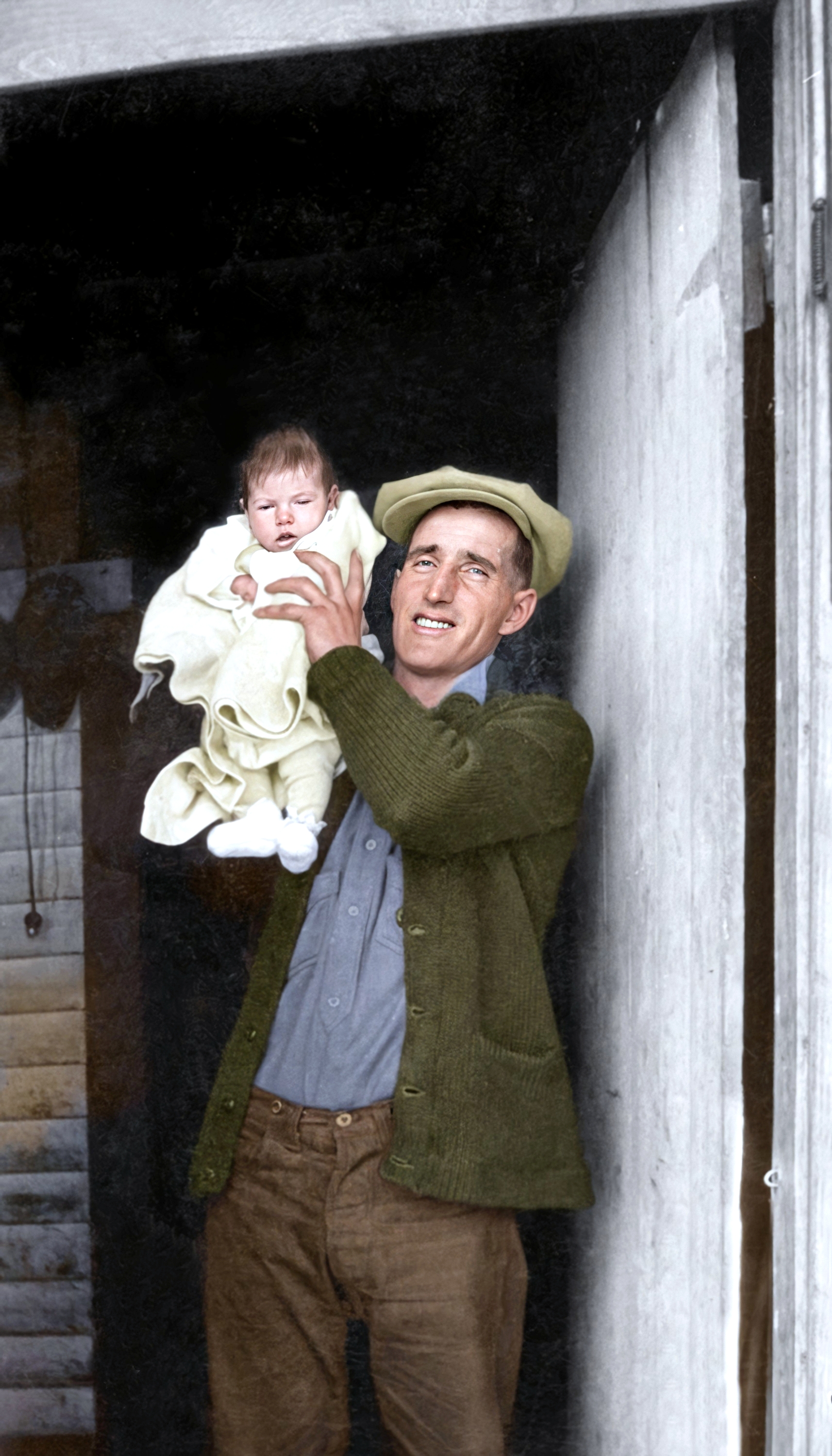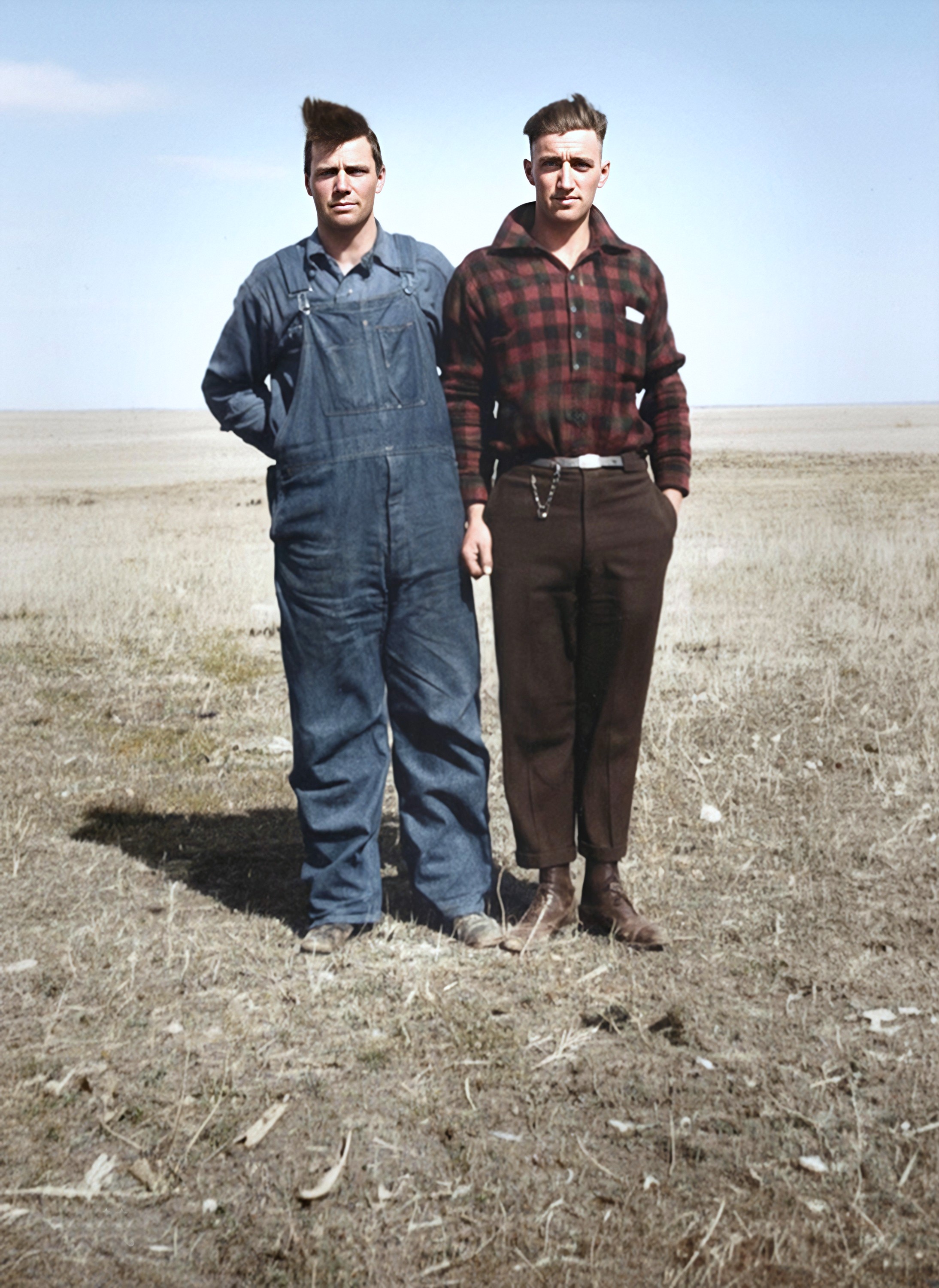 Oran Ralph Abbey, on the left, and his friend, James Audrey "Jimmy" Thompson, North Dakota, 1923. Created from black and white photos from Kay Koslan.