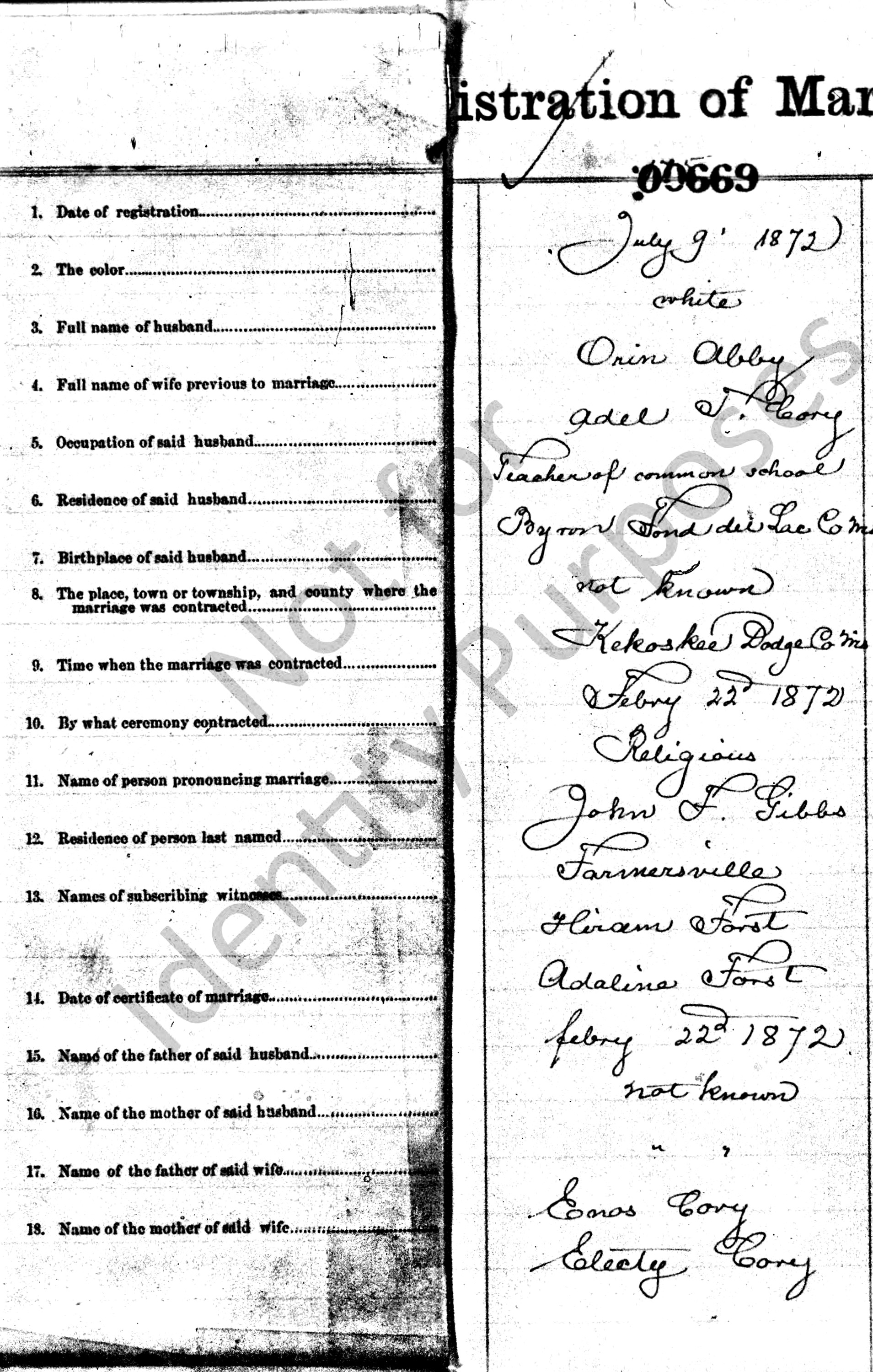 Orrin Abner Abbey and Adella T. "Delle" Corey were married February 22, 1872, in the Village of Kekoskee, Dodge Co., WI.