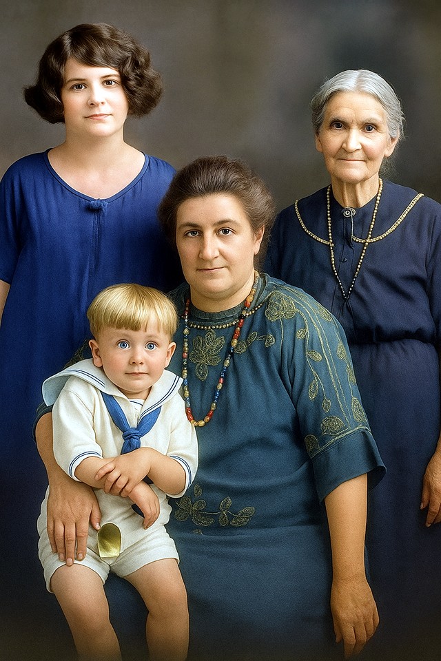 Della May (Harris) Newman is in the center, holding one of her grandsons, Melvin Leo Skoglund (born February 22, 1924, in Voltaire, McHenry Co., ND). Pearl Ann (Newman) Skoglund, Della's daughter, is on the left, and the woman on the right is Sarah Ann (Abbey) Harris. This photo was taken in 1924 in Saskatchewan, Canada, two years before Della May (Harris) Newman died at Olive Mae (Newman) Arvidson's house in Shaunavon, Saskatchewan, Canada.