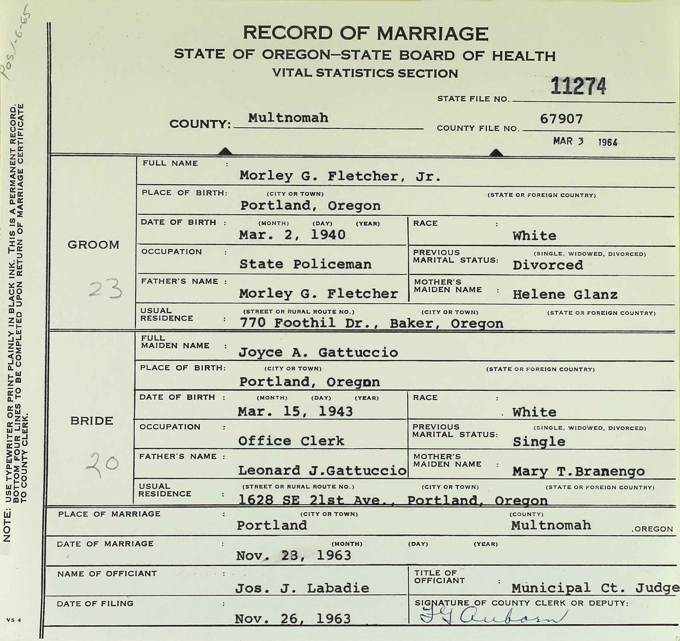 Morley Glenwood Fletcher Jr. (age 23), a divorcee, and Joyce A. Gattuccio (age 20), a maiden, were married November 23, 1963, in Portland, Multnomah Co., OR.