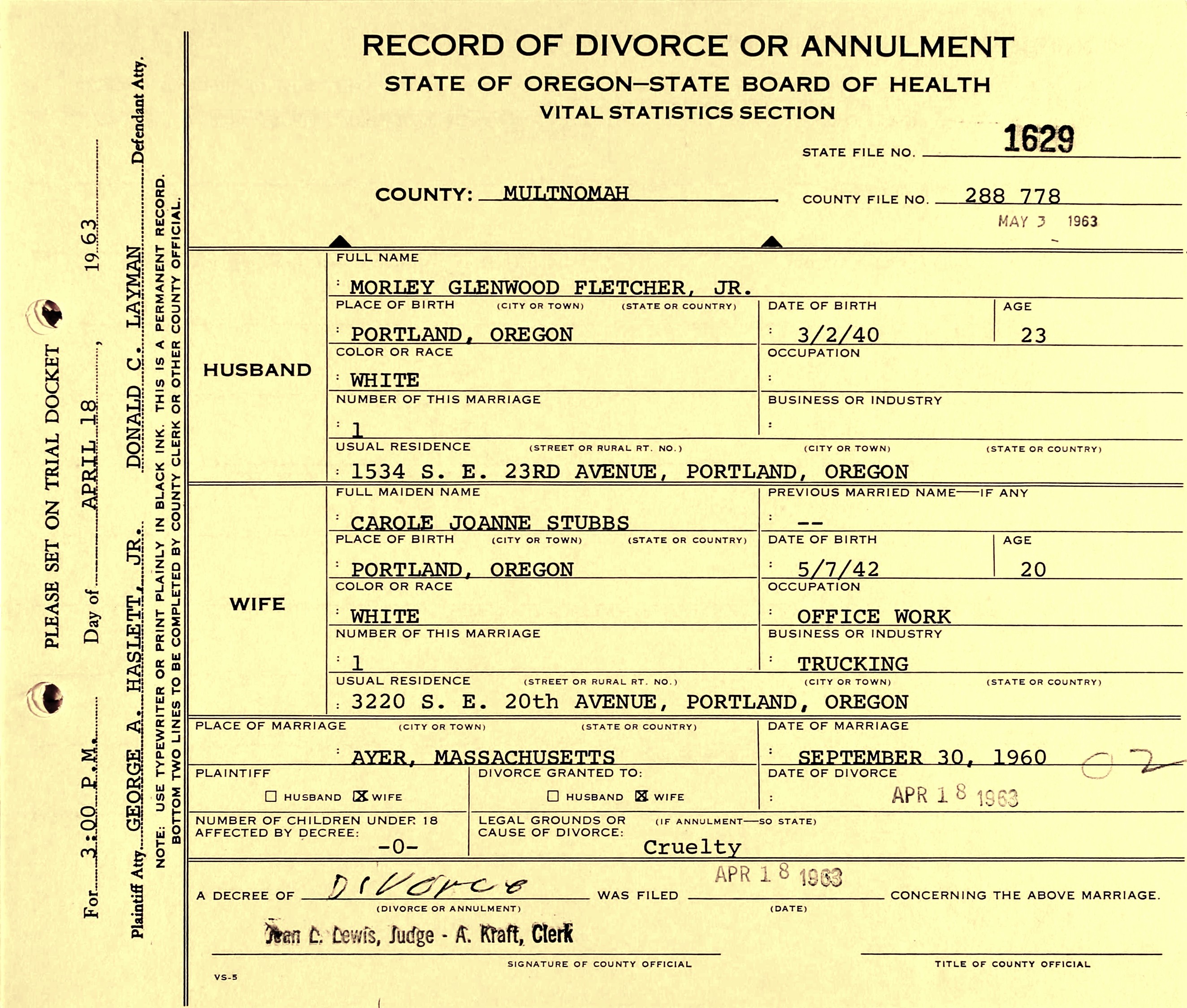 Morley Glenwood Fletcher Jr. (age 23), and Carole Joanne (Stubbs) Fletcher (age 20), were divorced April 18, 1963, in Portland, Multnomah Co., OR.