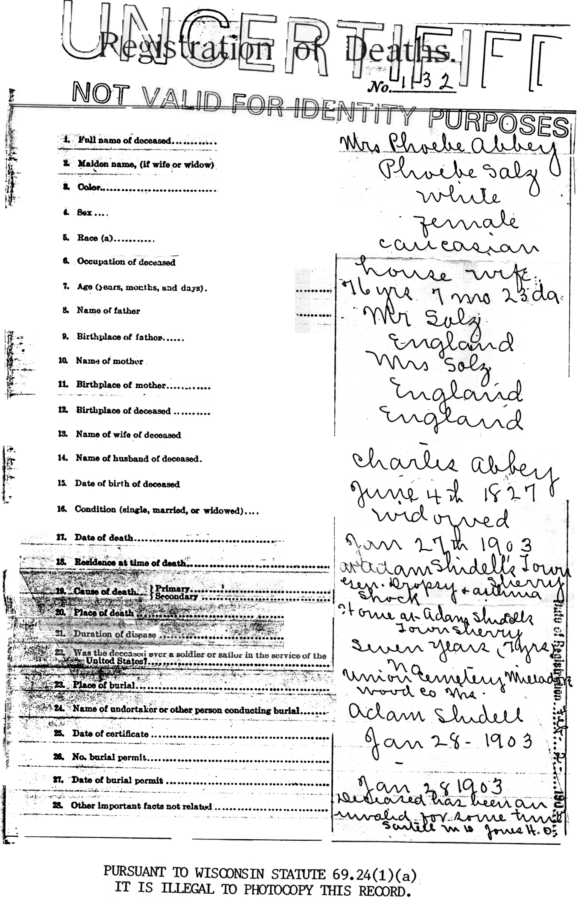 Phoebe Elizabeth "Phebe" (Searle) Abbey died January 27, 1903, at the Adam Shidell residence, Town of Sherry, Wood Co., WI, at age 76. Buried in Union Protestant Cemetery, Milladore, Wood Co., WI.