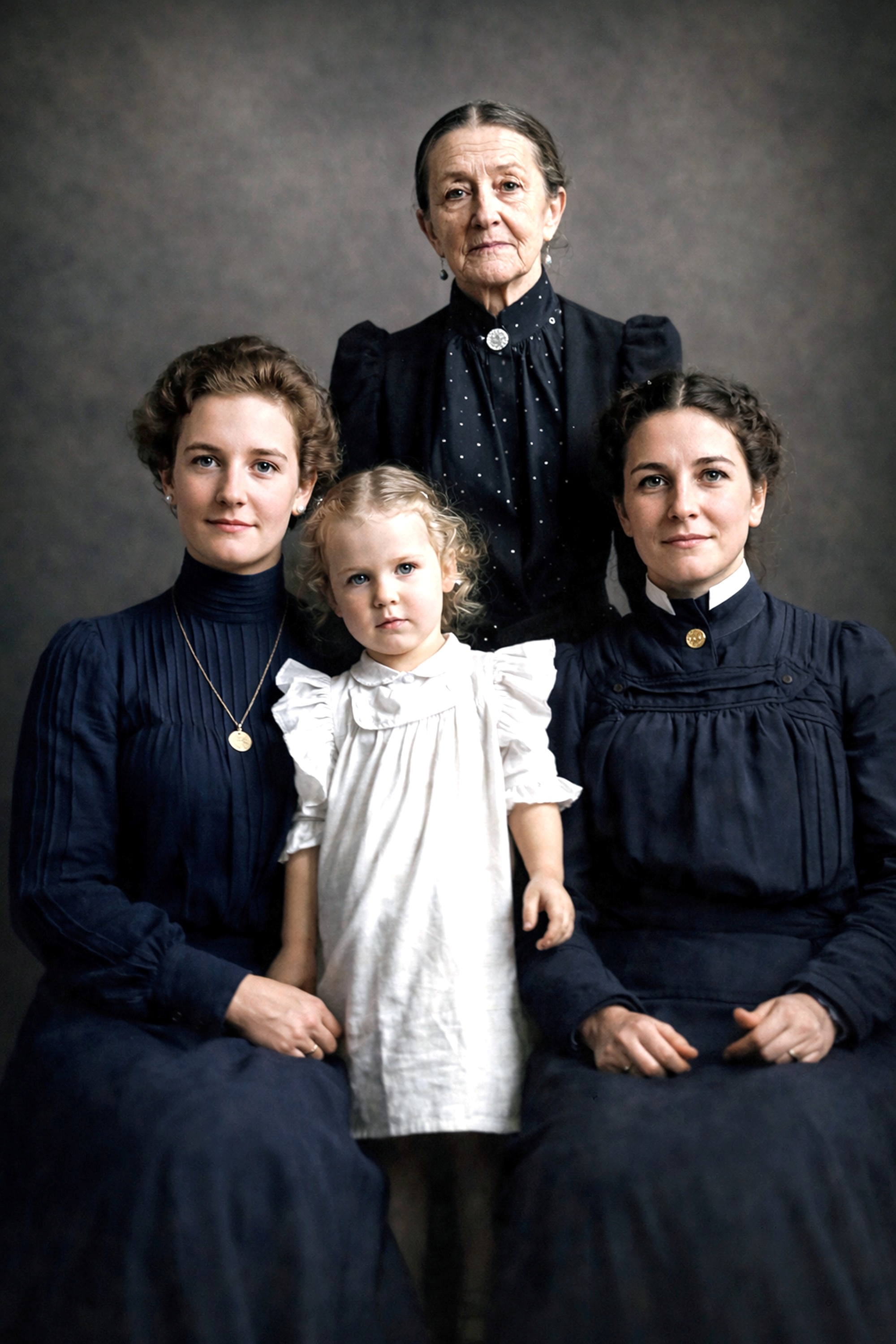Iva May "Ivy" (Abbey) Mayfield, Melva Irene Mayfield, Phoebe Elizabeth "Phebe" (Searle) Abbey, and Ida Elmira (Blake) Abbey, Leonard Studio, Richland Center, Richland Co., WI, about 1902. Thanks to the Trace family for making this image available.