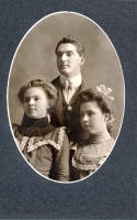 Alora M. "Laura" Mayfield, Asa Esmund Mayfield, and Kathryn R. "Kittie" Mayfield, Richland Center, Richland Co., WI, about 1905. Leonard Studio, Richland Center, Richland Co., WI.