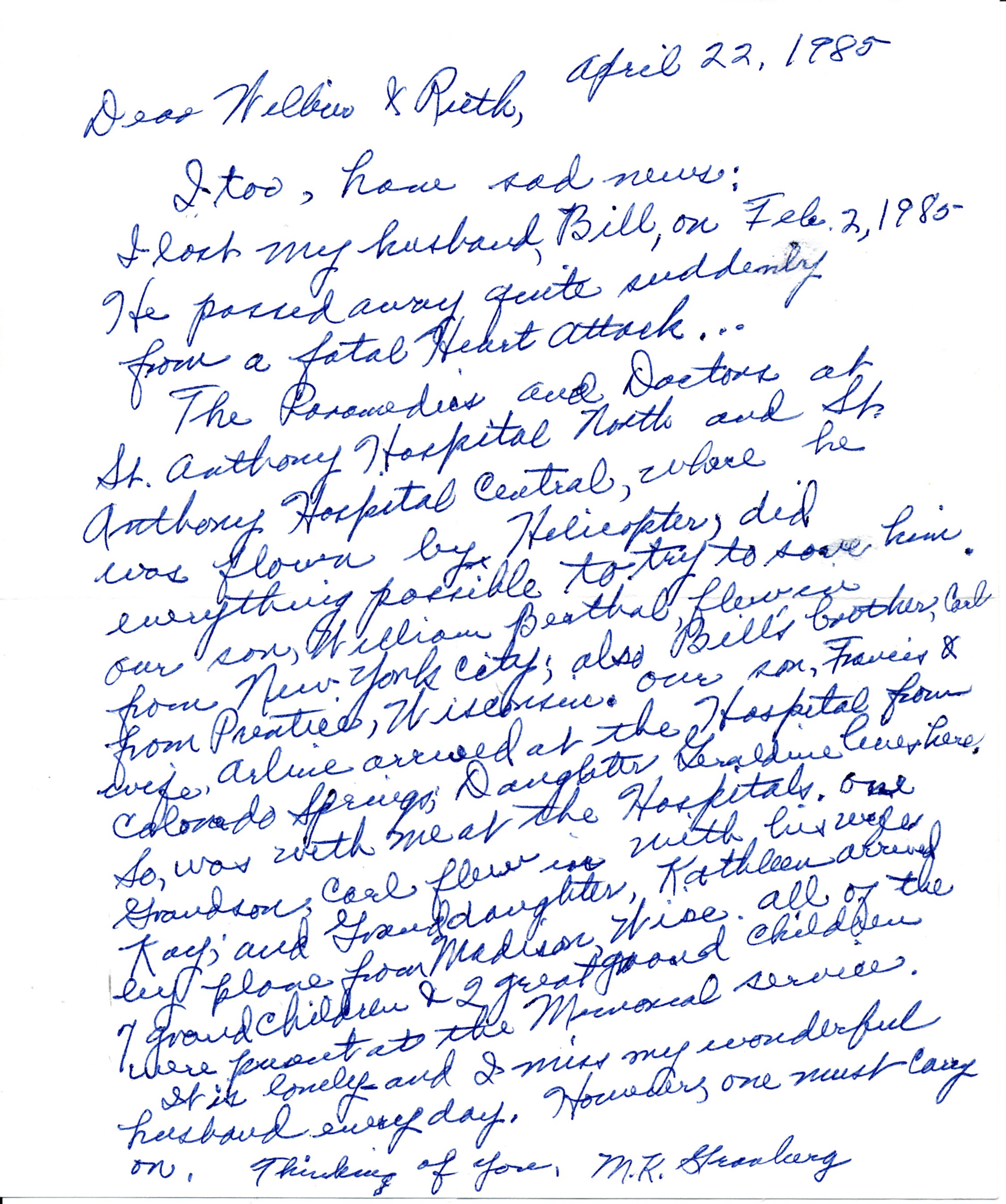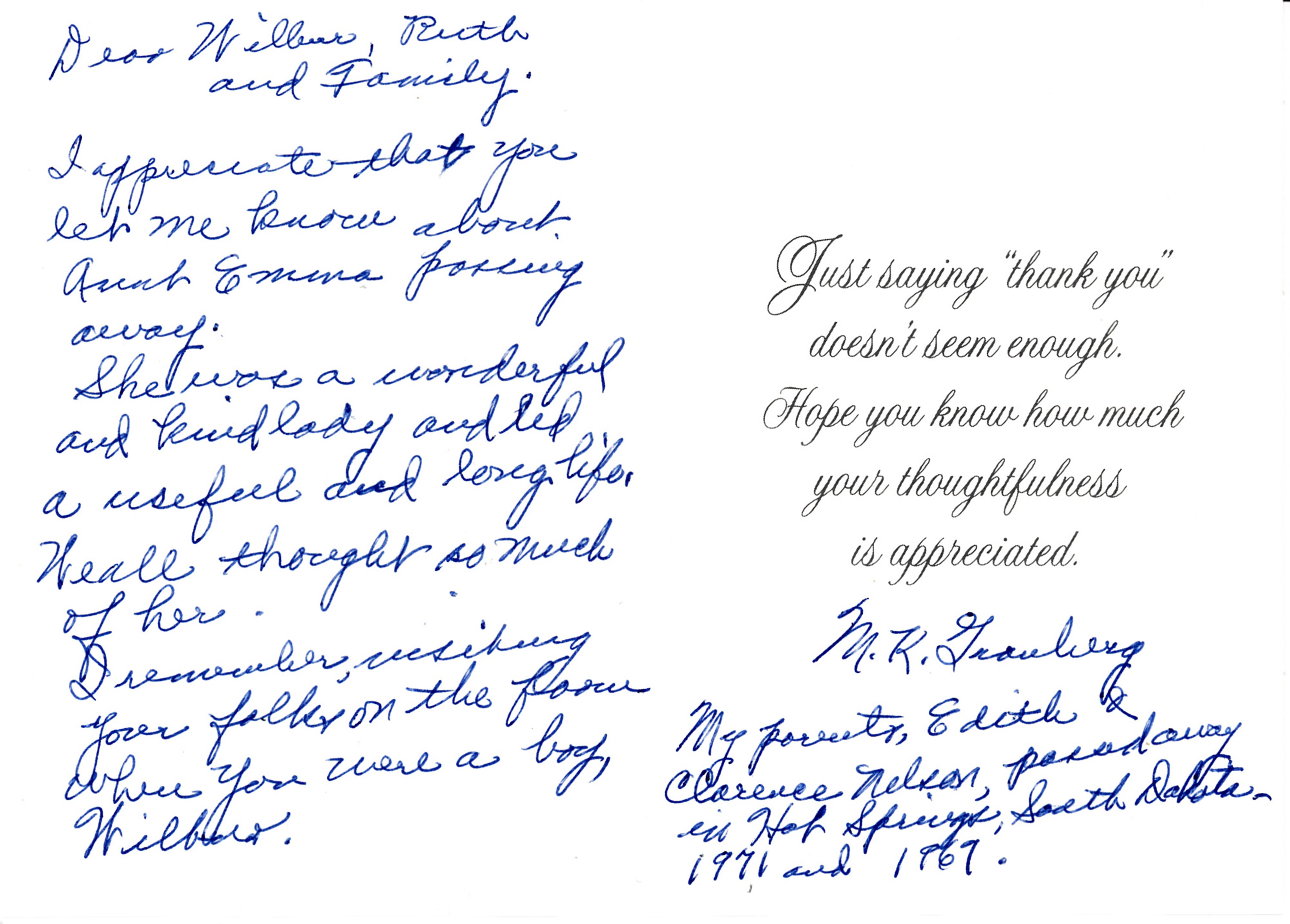 Myrtle Katherine (Nelson) Granberg sent these letters to Wilbur and Ruth Larson following the death of Emma Jane (Abbey) Larson in 1985.