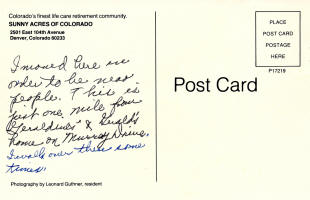 Myrtle soon moved to a retirement community, Sunny Acres of Colorado, 2501 E. 104th Ave., Apt. #57, Denver, CO, in order to be near people.