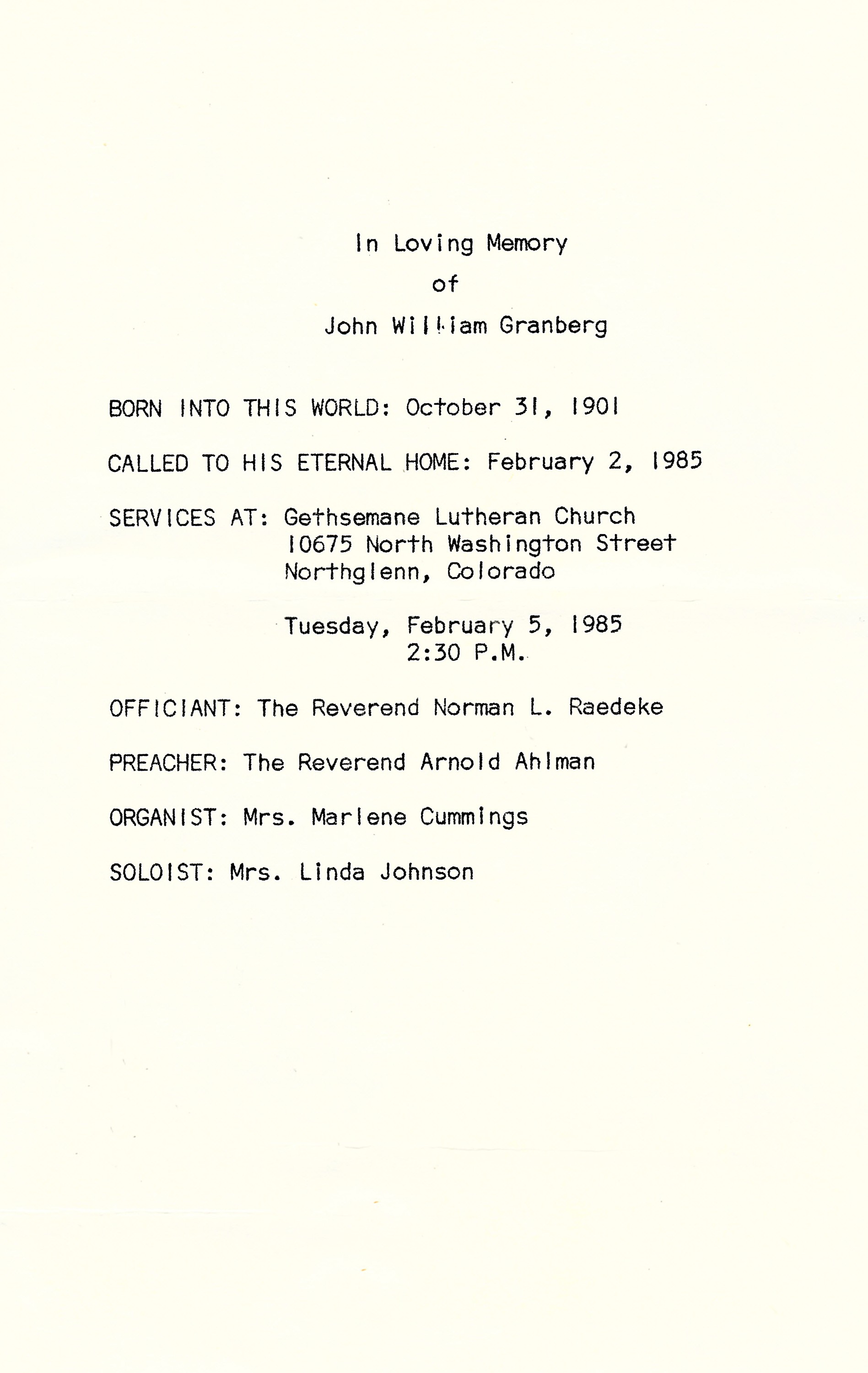 John William "Bill" Granberg died February 2, 1985, at St. Anthony's Hospital Central, Denver, Adams Co., CO, at age 83.