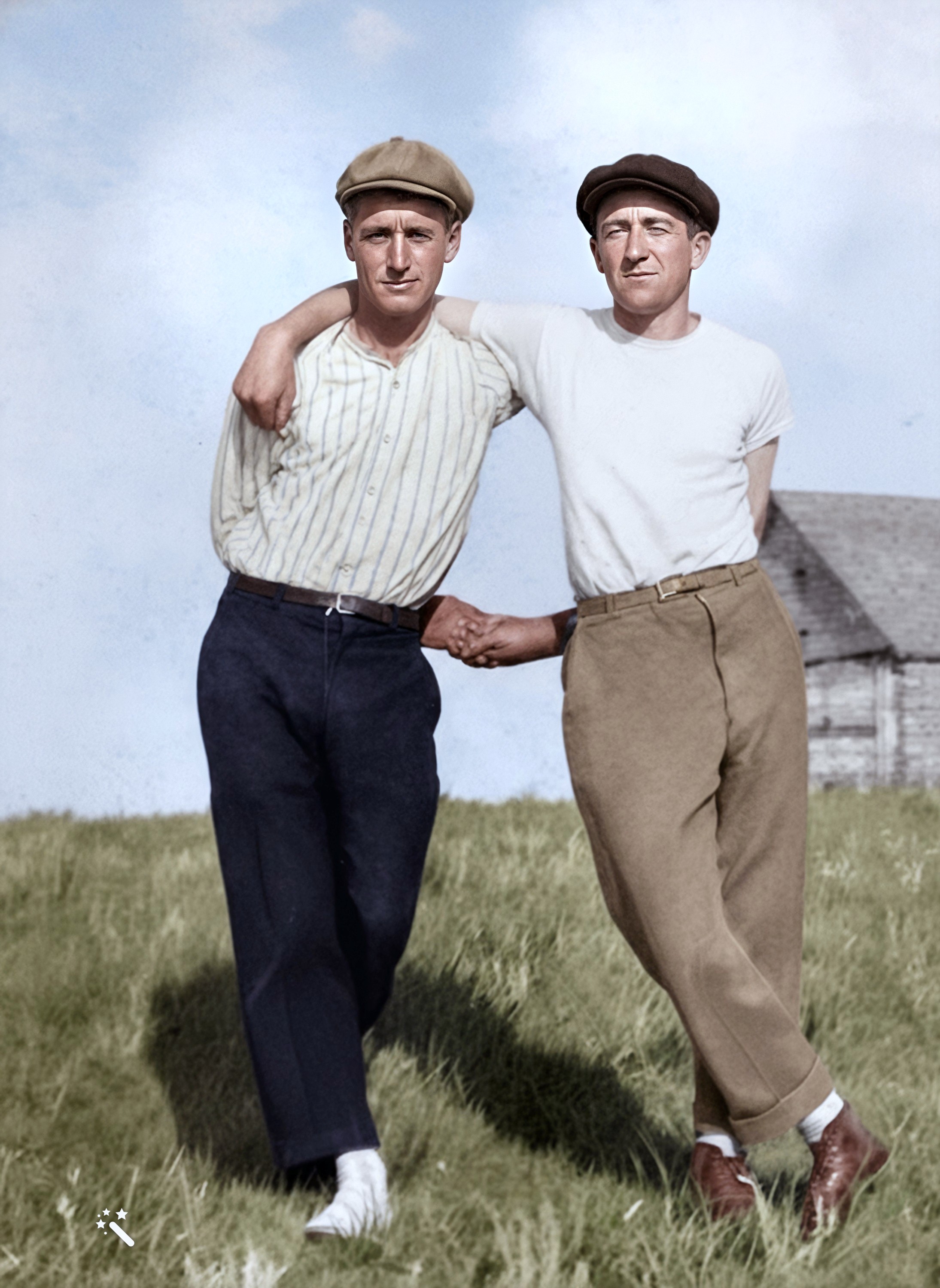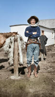 Oran Ralph Abbey, on the left, and his friend, James Audrey "Jimmy" Thompson, North Dakota, 1923. Created from black and white photos from Kay Koslan.