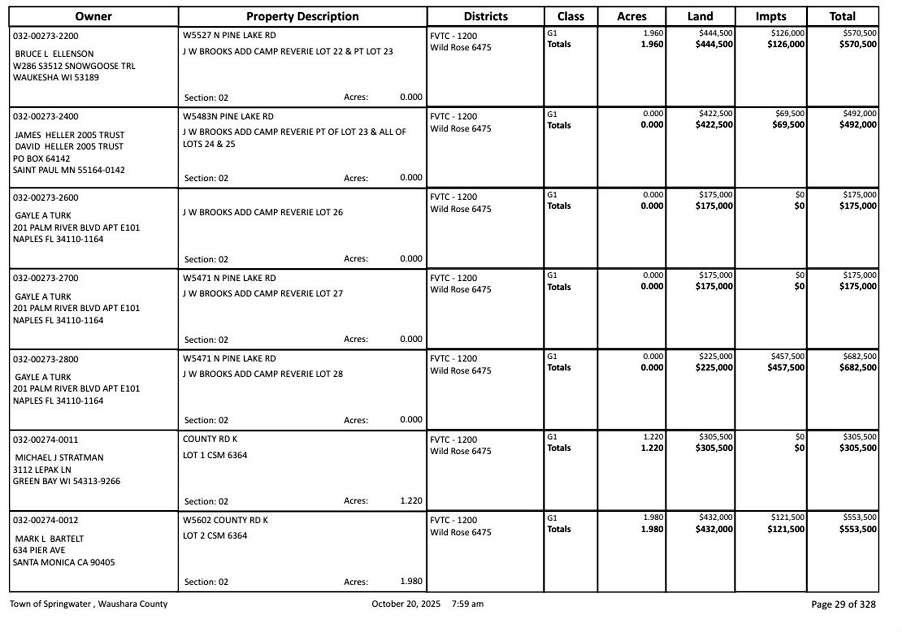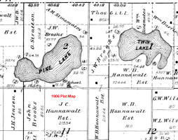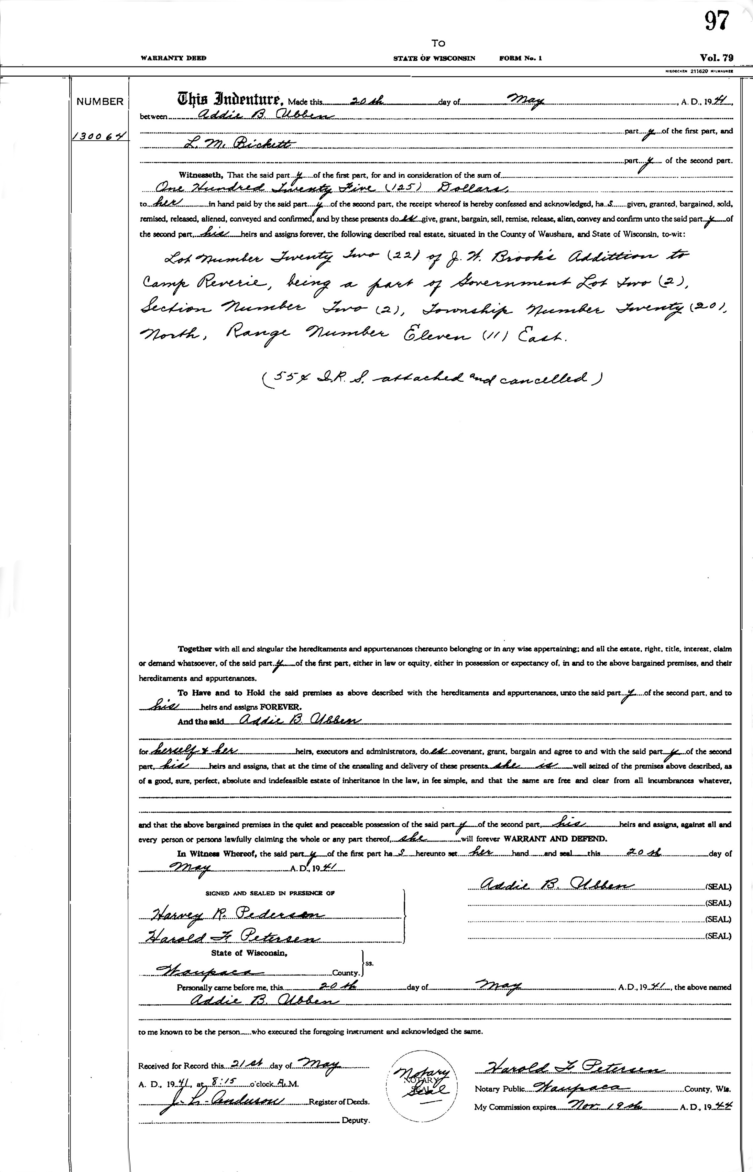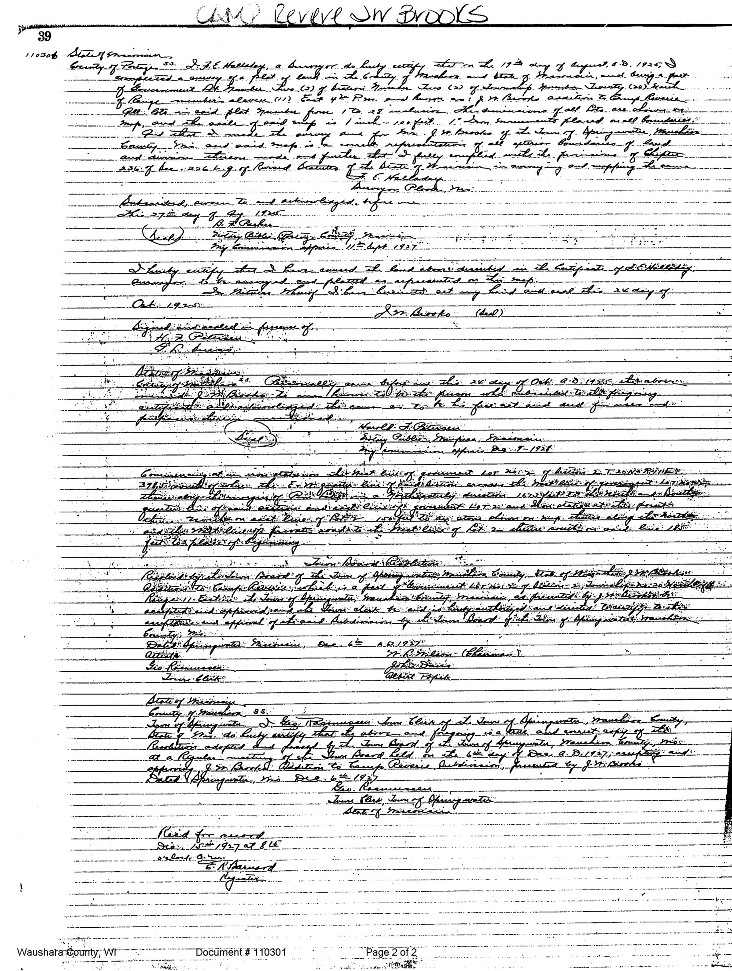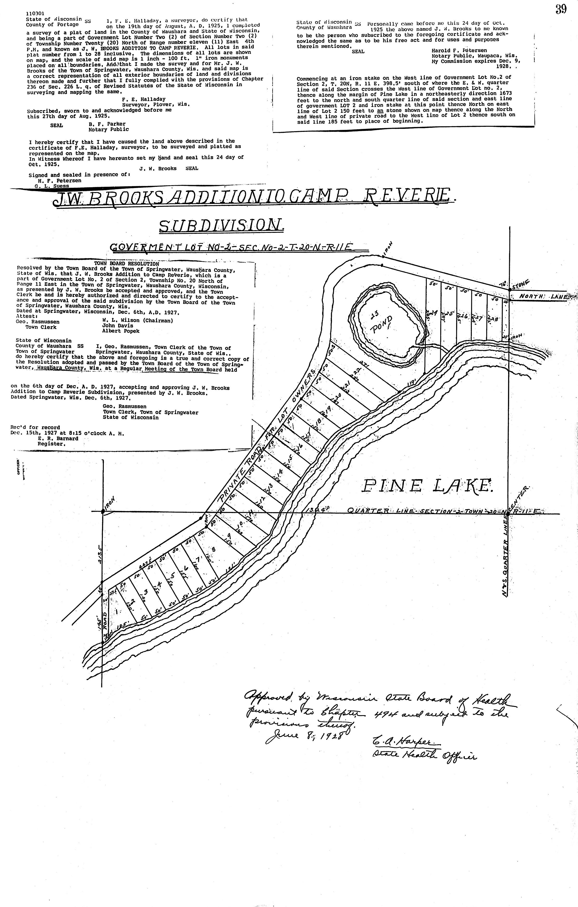 This portion of the 1920 Plat Map is for part of the Town of Springwater, Waushara Co., WI, and shows that the Camp Reverie Subdivision had not been platted. This portion of the 1924 Plat Map is for part of the Town of Springwater, Waushara Co., WI, shows that the Camp Reverie Subdivision has already been platted. This portion of the 1924 Plat Map is for part of the Town of Springwater, Waushara Co., WI, shows that the Camp Reverie Subdivision had already been platted, probably by J. W. Brooks. The original Lot Plat of J. W. Brooks Addition to the Camp Reverie Subdivision. The survey was completed by F. Halliday, a surveyor from Plover, Waushara Co., WI, on August 19, 1925. The final approval was given by the Town of Springwater, Waushara Co., WI, on December 15, 1927. LeRoy McVey "Roy" Bickett purchased Lot 22 in the J. W. Brooks Addition from Addie (Brooks) Ubben, the daughter of John Wesley Brooks, on May 20, 1941. She had probably inherited the lot from her parents, who both died in 1929. LeRoy McVey "Roy" Bickett and Gertrude Pearl Patricia "Gertie" (Baker) Bickett, about Spring, 1942, probably at Pine Lake, Town of Springwater, Waushara Co., WI. Reed Allan Larson picture 1. LeRoy McVey "Roy" Bickett purchased Lot 23 in J. W. Brooks Addition from Edwin and Adelaide) Rasmussen of Racine Co., WI, on June 16, 1944. LeRoy McVey "Roy" Bickett died May 4, 1958, at St. Mary's Hospital, Watertown, Jefferson Co., WI, at age 75. Buried in the Bickett/Fiegel plot, Grave 9, Lot 6, Block 32, Oak Hill Cemetery, Watertown, Jefferson Co., WI. Primary cause of death: Bleeding Duodenal Ulcer due to Generalized Arteriosclerosis. Secondary cause of death: Diabetic Acidosis. According to the terms of the Last Will and Testament of LeRoy McVey "Roy" Bickett, ownership of these properties became the property of Helen Means (Bickett) Fiegel. The side and end of the boathouse at Pine Lake, Town of Springwater, Waushara Co., WI, first before, and then after Wilbur Almo "Bill" Larson painted it in 1953, and years later photographed in 2016 by Reed Allan Larson (last). The cottage at Pine Lake, Town of Springwater, Waushara Co., WI, 2016. These pictures were taken by Reed Allan Larson, grandson of LeRoy McVey "Roy" Bickett. Helen Means (Bickett) Fiegel inherited the two Pine Lake properties in the Town of Springwater, Waushara Co., WI, on July 9, 1959, from her father's estate, and they were both sold on July 29, 1960.The July 29, 1960, sale of Lot 22 and part of Lot 23 in J. W. Brooks Addition to Camp Reverie, was sold by the surviving owner, Helen Means (Bickett) Fiegel, to Edward C. and Joyce H. Ellison, of Waukesha, Waukesha Co., WI. Waushara County, WI, tax records lot owners on Pine Lake surrounding Bickett Lot 22 and 3 part of Lot 23, as of 2025.